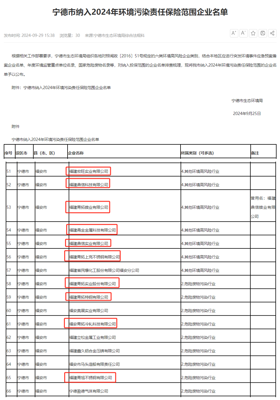2024年9月25日,寧德市生態(tài)環(huán)境局公布納入2024年環(huán)境污染責(zé)任保險范圍企業(yè)名單。