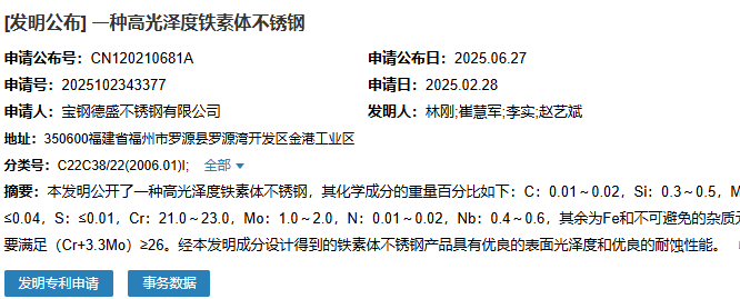 2025年6月27日,寶鋼德盛不銹鋼有限公司成功申請(qǐng)一項(xiàng)名為“一種高光澤度鐵素體不銹鋼”專利,申請(qǐng)公布號(hào)為CN120210681A,申請(qǐng)日期為2025年2月28日。