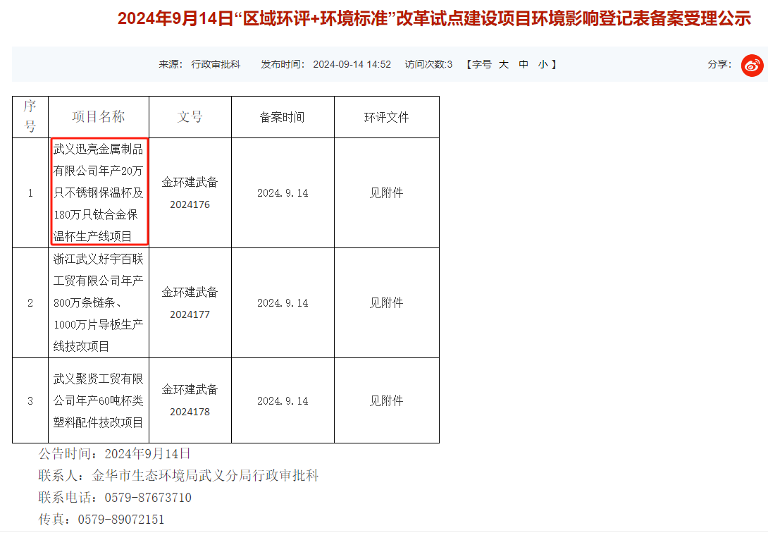 9月14日,金華市生態(tài)環(huán)境局武義分局就武義迅亮金屬制品有限公司年產(chǎn)20萬(wàn)只不銹鋼保溫杯及180萬(wàn)只鈦合金保溫杯生產(chǎn)線項(xiàng)目環(huán)境影響報(bào)告表進(jìn)行登記備案受理公示。