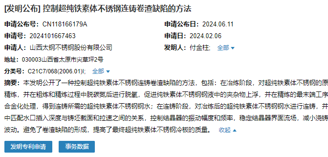 2024年6月11日,山西太鋼不銹鋼股份有限公司成功申請(qǐng)一項(xiàng)名為“控制超純鐵素體不銹鋼連鑄卷渣缺陷的方法”專利,申請(qǐng)公布號(hào)CN118166179A,申請(qǐng)日期為2024年2月6日。