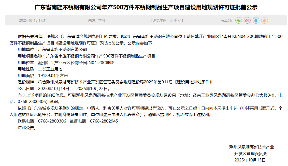 2025年10月13日,廣東省南旌不銹鋼有限公司年產(chǎn)500萬件不銹鋼制品生產(chǎn)項(xiàng)目建設(shè)用地規(guī)劃許可證批前公示,公示日期:2025年10月14日-2025年10月23日。