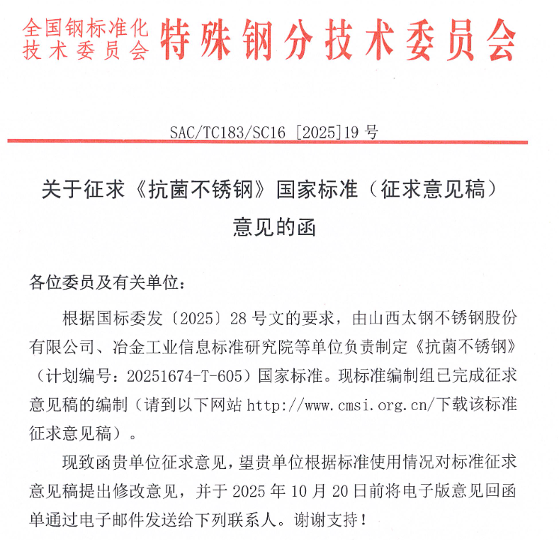 2025年8月21日,由山西太鋼不銹鋼股份有限公司、冶金工業(yè)信息標(biāo)準(zhǔn)研究院等單位負(fù)責(zé)制定《抗菌不銹鋼》(計(jì)劃編號(hào):20251674-T-605)國(guó)家標(biāo)準(zhǔn)已完成征求意見稿的編制。